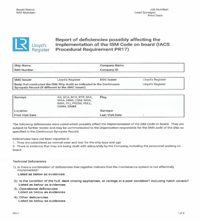 某轮近日在进行年度检验时因存在众多相关缺陷被检验人员出具了PR 17的报告(参下图), 随后公司及船舶被船级社要求3个月内对该轮进行附加审核,这不仅会产生相关费用,也会对公司及船舶声誉带来一定负面的影响。
